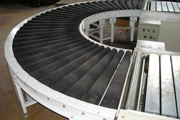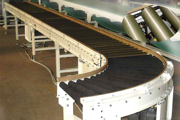 A.直輥轉(zhuǎn)彎機(jī):由于輥筒內(nèi)外側(cè)直徑不變,轉(zhuǎn)彎角速度不同,相同時間內(nèi)轉(zhuǎn)過的弧長不同,物件在轉(zhuǎn)彎的同時還發(fā)生自轉(zhuǎn),所以輸送物在轉(zhuǎn)彎時靠外側(cè)護(hù)欄、護(hù)輪、導(dǎo)軌的輔助進(jìn)行輸送。直輥轉(zhuǎn)彎機(jī)只適用于回轉(zhuǎn)體或無角度要求的物件輸送,物料轉(zhuǎn)出時會改變輸送方向。