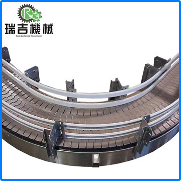 塑料鏈板輸送線有稱為頂板鏈板輸送線,主要應用于玻璃瓶、PET飲料瓶的空瓶、實瓶輸送,亦可用于輸送濾清器、軸承等五金件的水平、轉(zhuǎn)彎、爬坡輸送;以標準鏈板為承載面,由馬達減速機為動力傳動;我們可以通過多列鏈板并行,使鏈板輸送機做的很寬并形成差速,并可以利用多列鏈板的速度差使多列輸送在無擠壓的情況下將輸送物料變?yōu)閱瘟休斔停瑥亩鴿M足飲料貼標、灌裝、清洗等設備的單列輸送的要求,同樣也可以使單列變成多列并行走緩慢,從而產(chǎn)生儲存量,滿足殺菌機、儲瓶臺、冷瓶機的大量供料的要求,我們可以將兩條鏈板輸送機的頭尾部做成重疊式的混合鏈使得瓶(罐)體處于動態(tài)過渡狀態(tài),使鏈板輸送線上不滯留物料,可以滿足壓力和無壓力輸送,解決了中、高速生產(chǎn)線輸送時擠、卡、倒、破、噪聲大、不穩(wěn)定可靠等問題,塑料鏈板輸送線被廣泛的運用在飲料、啤酒、日化、制藥、汽車缸套、活塞、濾清器、小五金件生產(chǎn)的各個環(huán)節(jié)。